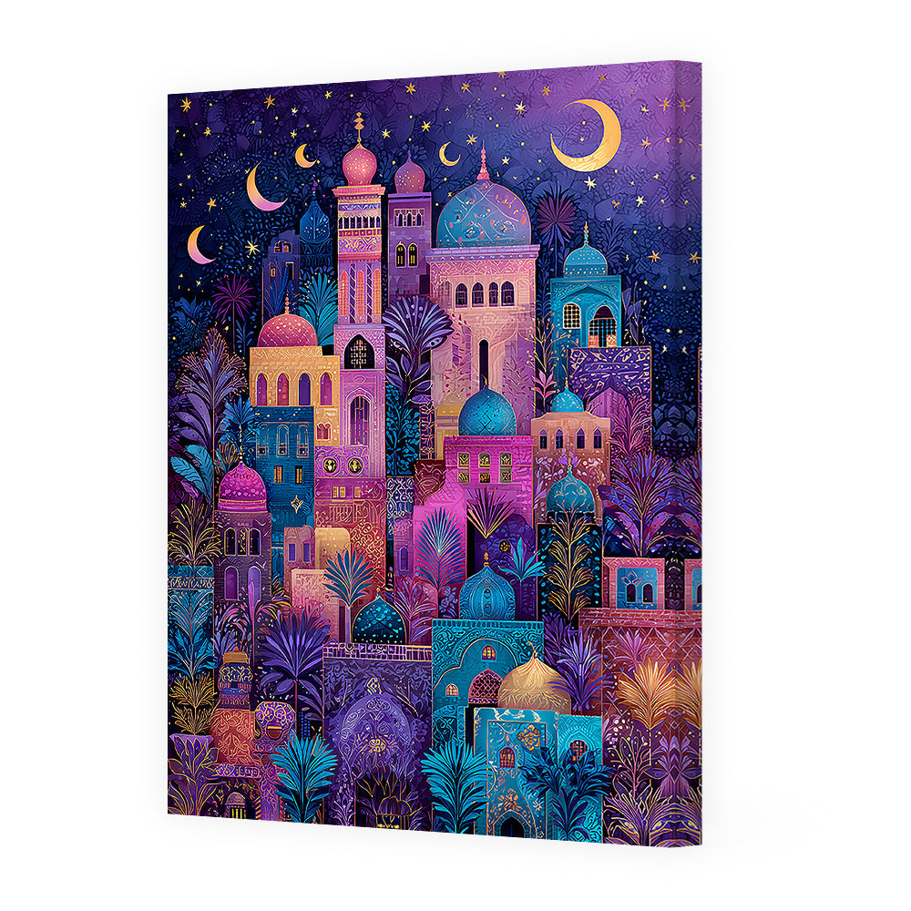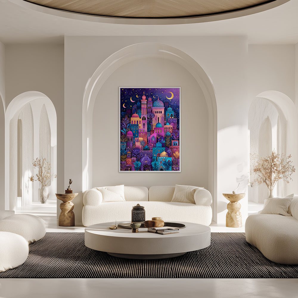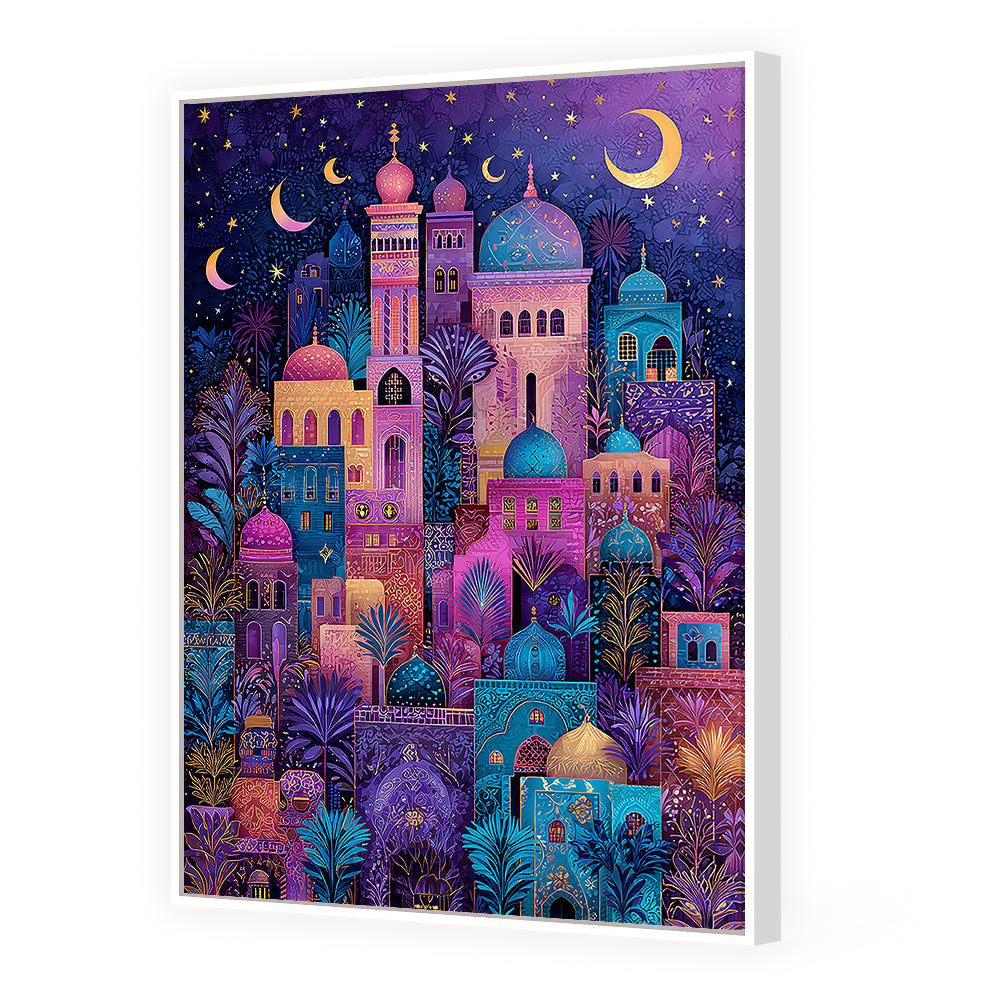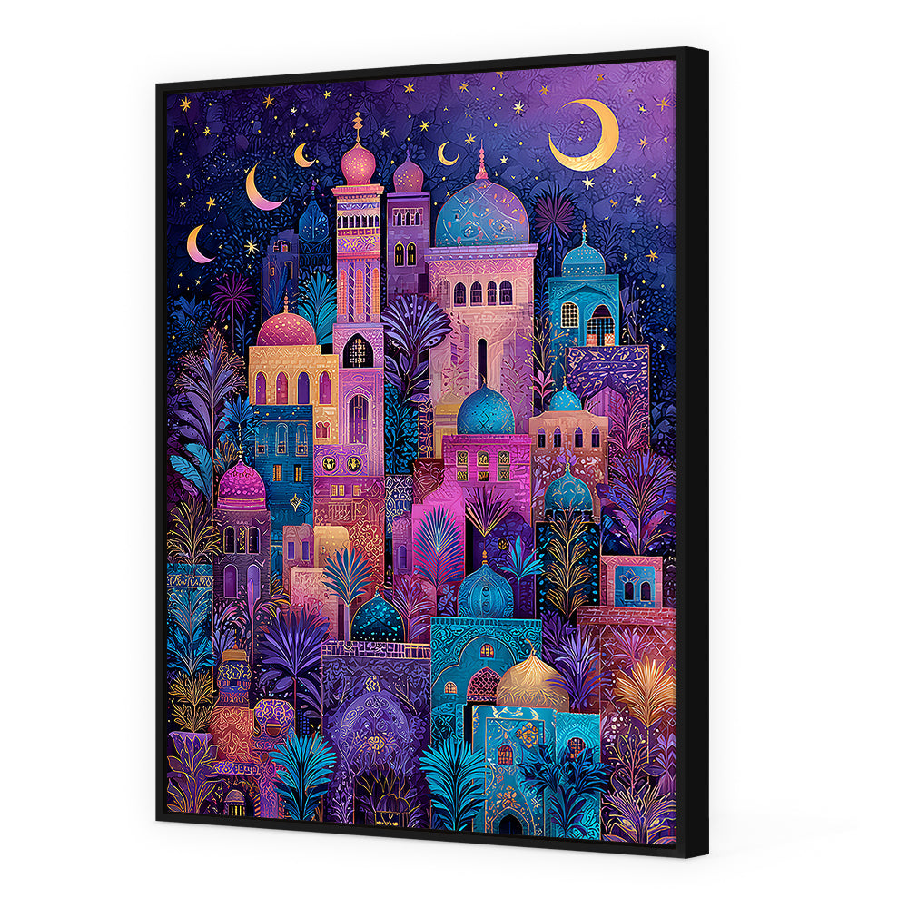 Évocative scène nocturne de minarets colorés sous un ciel étoilé, mêlant tradition et mystère.