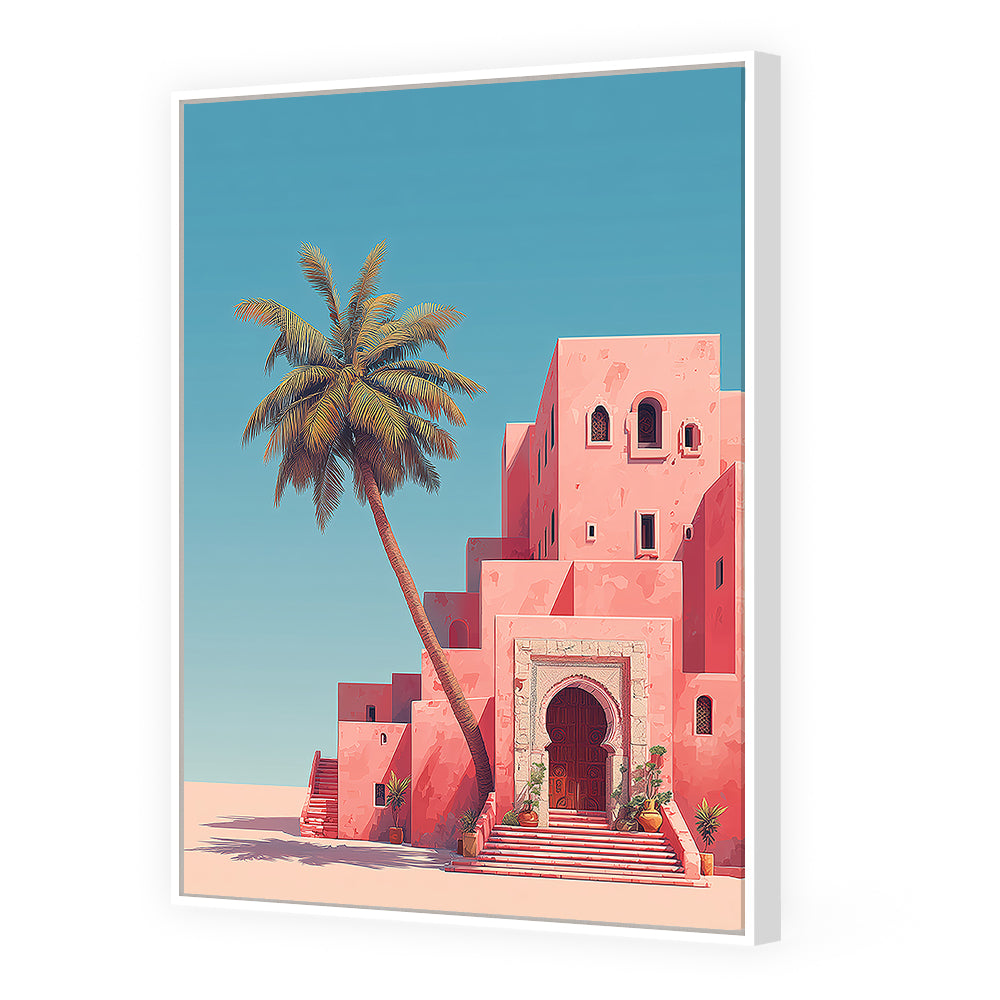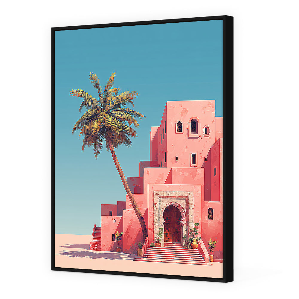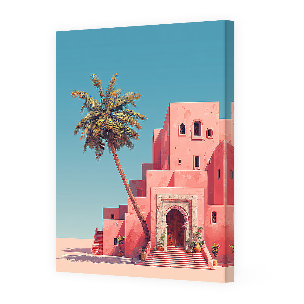 Une architecture rose se détache sous un ciel bleu, accompagnée d'un palmier majestueux.