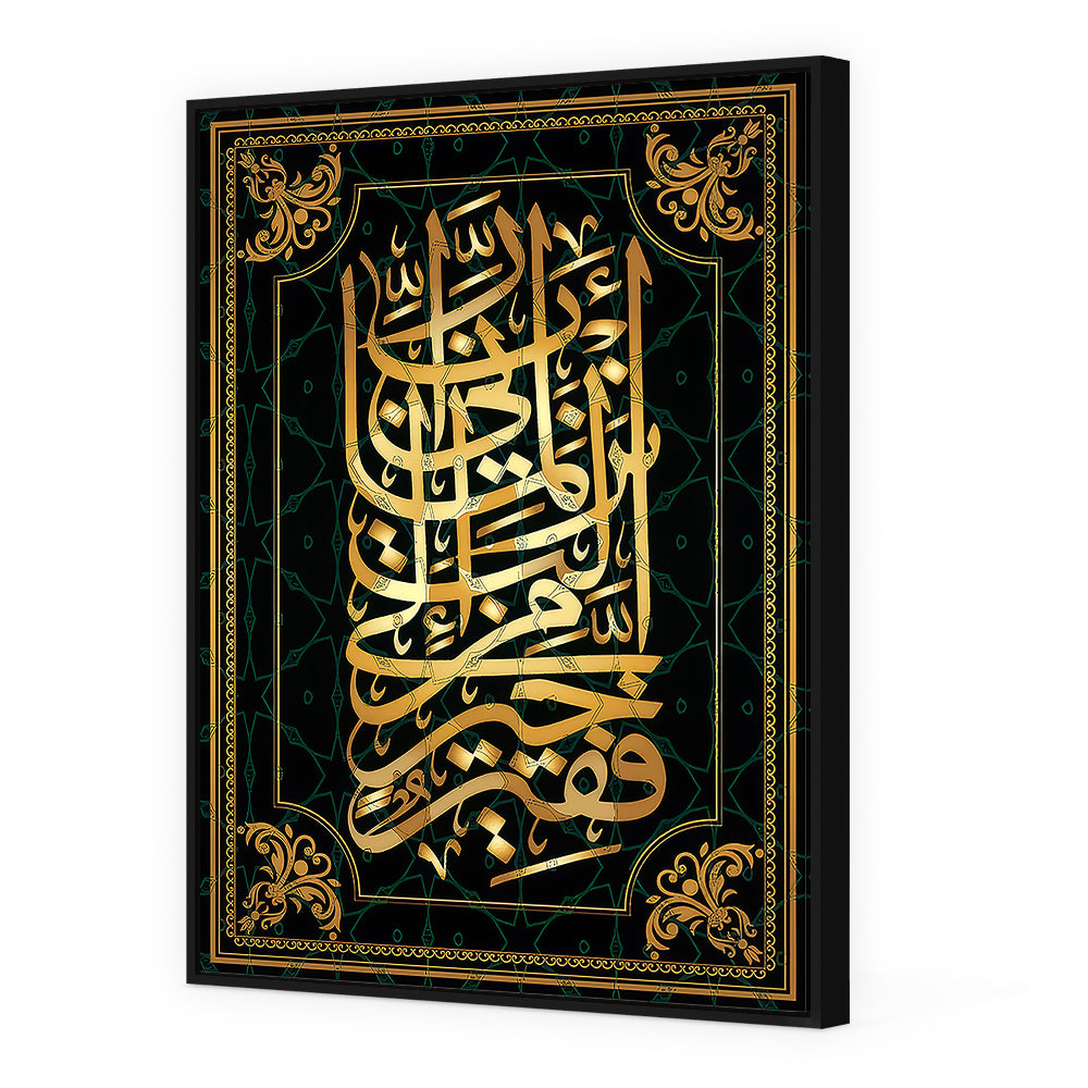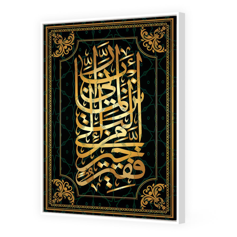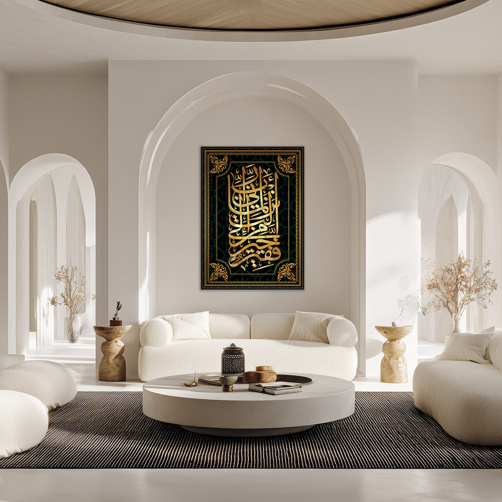Calligraphie dorée élégante sur fond noir, rehaussée de motifs arabesques raffinés.