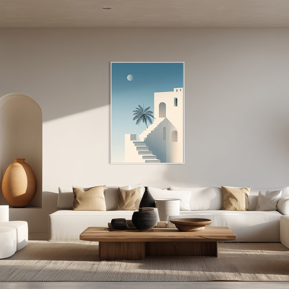 Scène sereine d'une architecture minimaliste sous un ciel bleu apaisant.