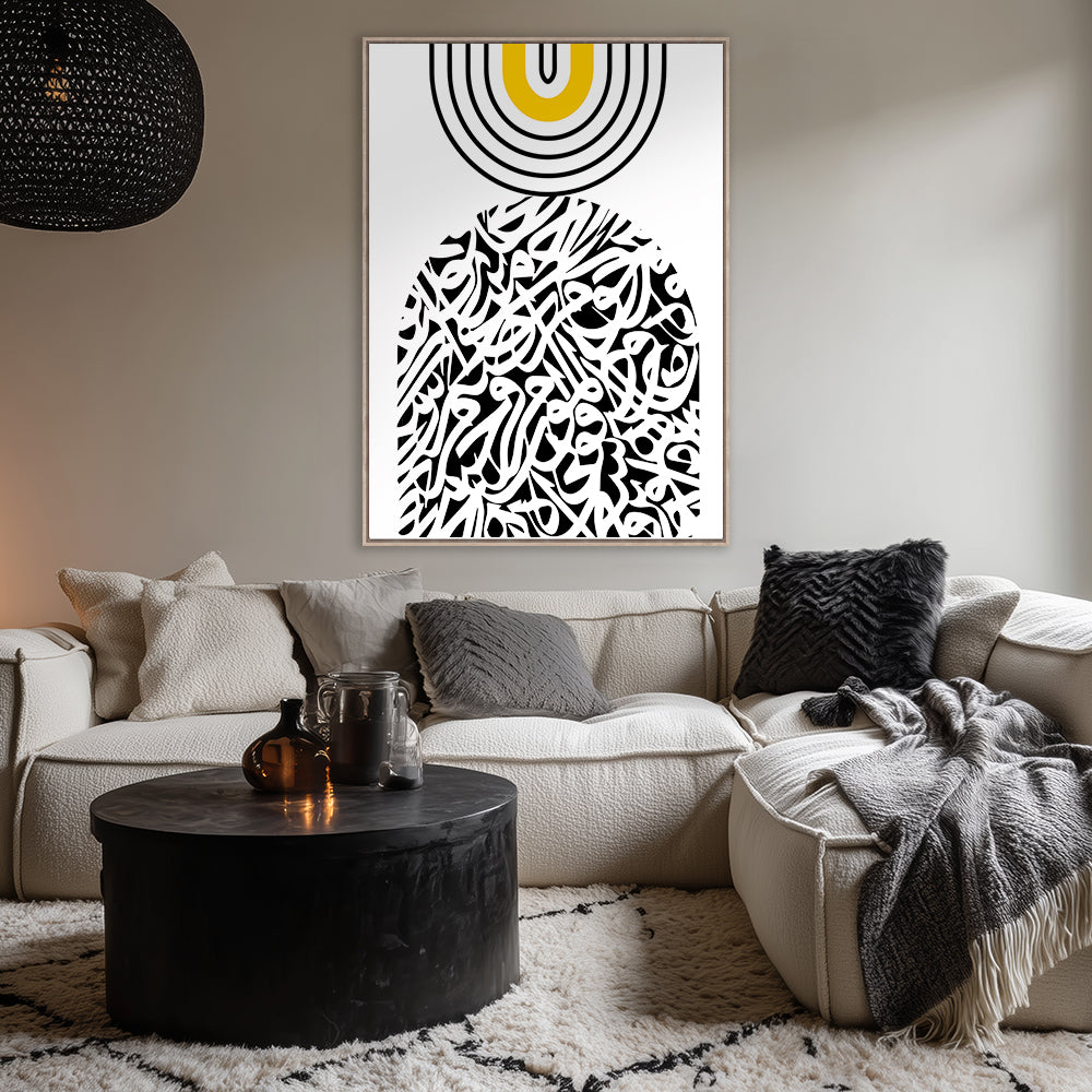 Une fusion captivante de calligraphie et motifs abstraits en noir, blanc et jaune.