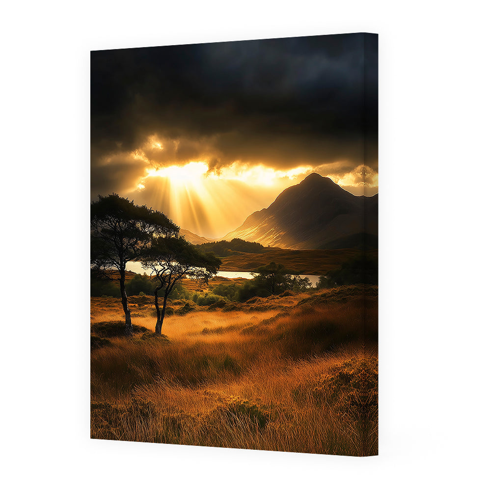 Paysage montagneux illuminé par des rayons dorés, créant une ambiance mystique et apaisante.