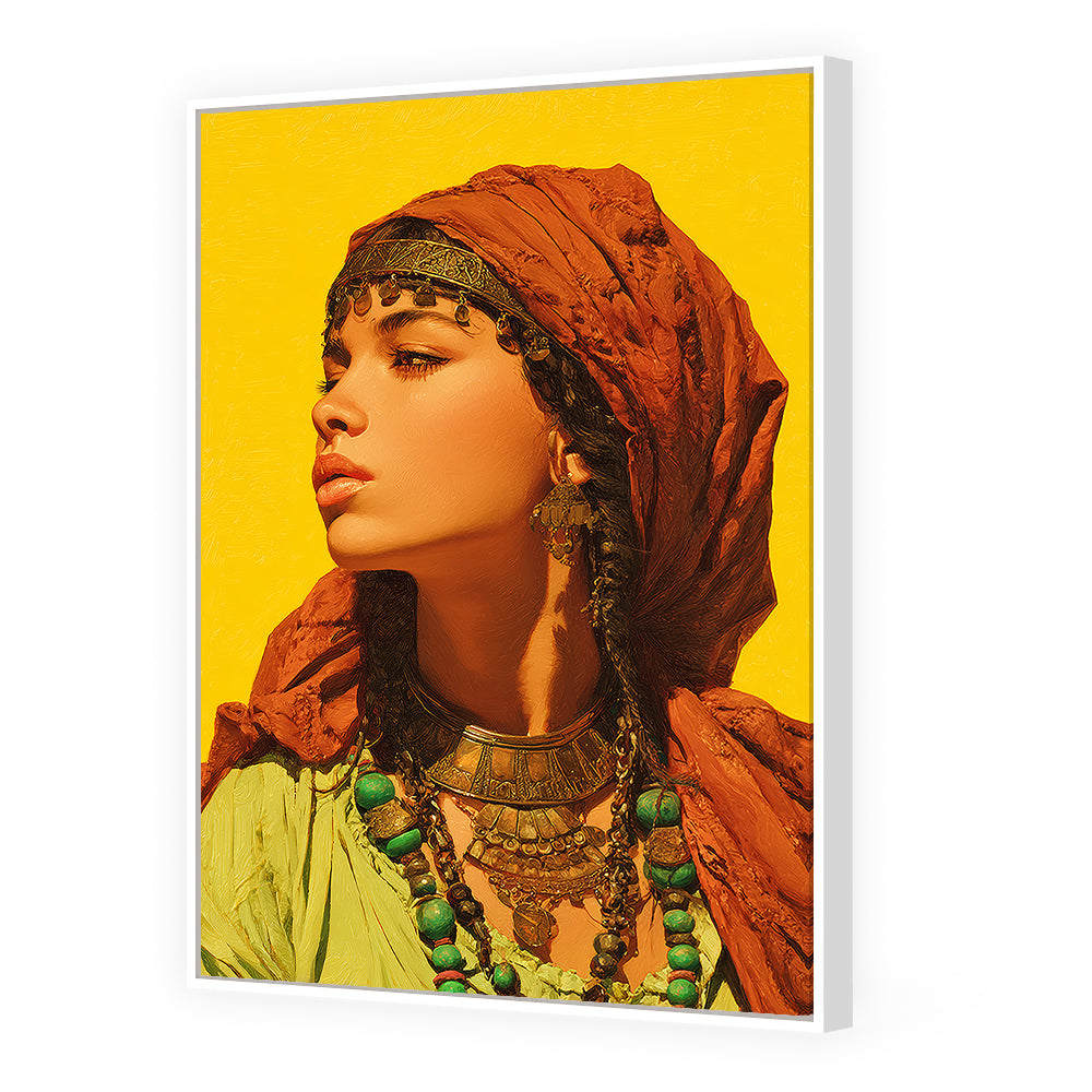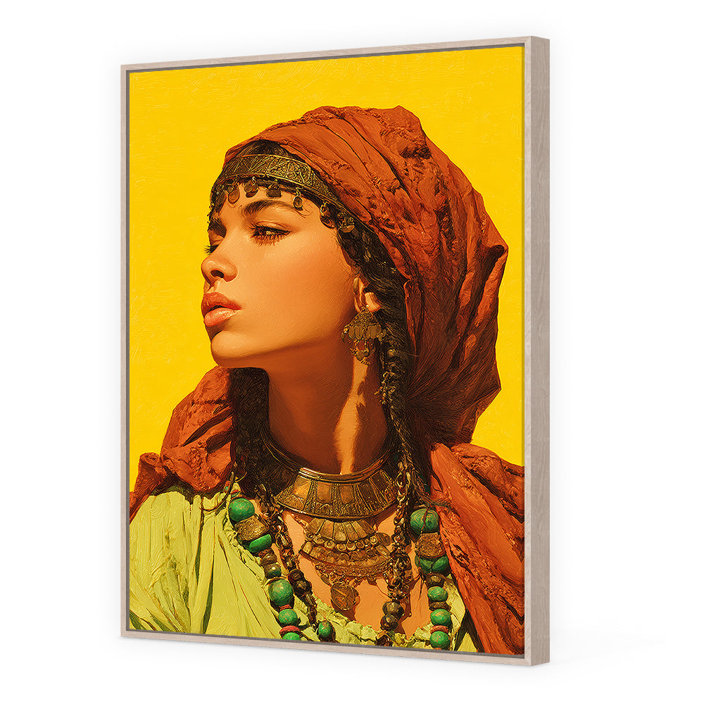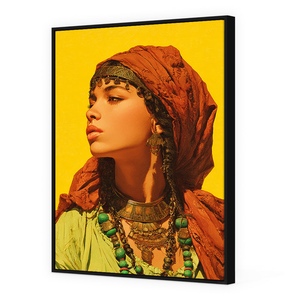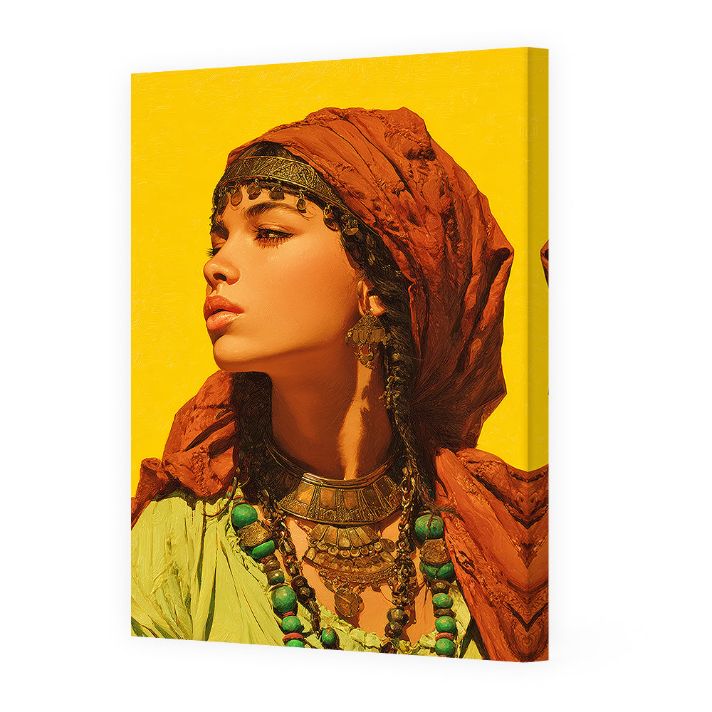 Portrait vibrant d'une femme en tenue traditionnelle, capturant l'essence du désert en couleurs éclatantes.