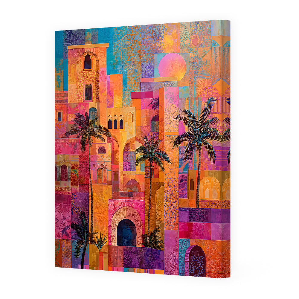 Évadez-vous dans un monde vibrant d'arches et de palmiers aux teintes éclatantes.