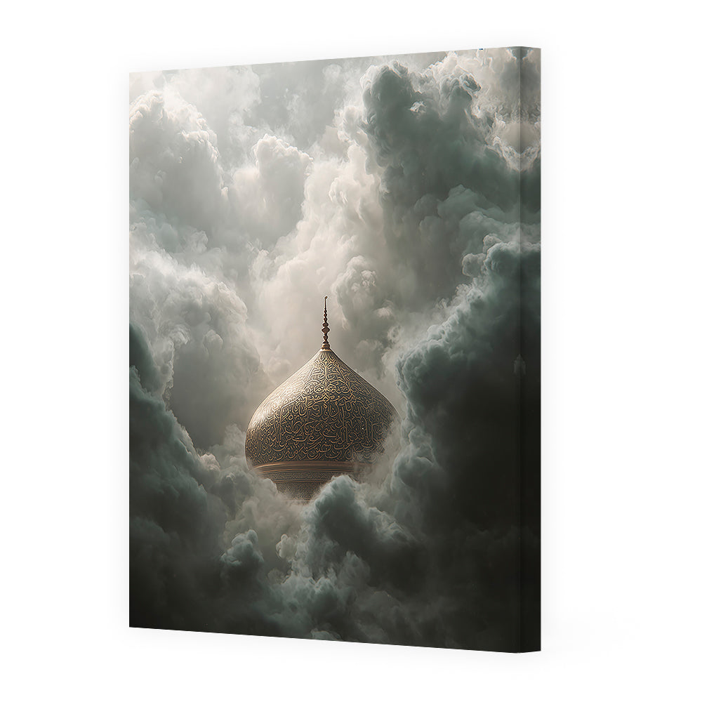 Un dôme doré émerge majestueusement parmi des nuages tourbillonnants, créant une scène mystique et inspirante.