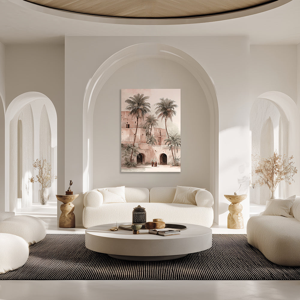 Scène paisible de palmiers et d'architecture traditionnelle, évoquant une oasis de tranquillité.