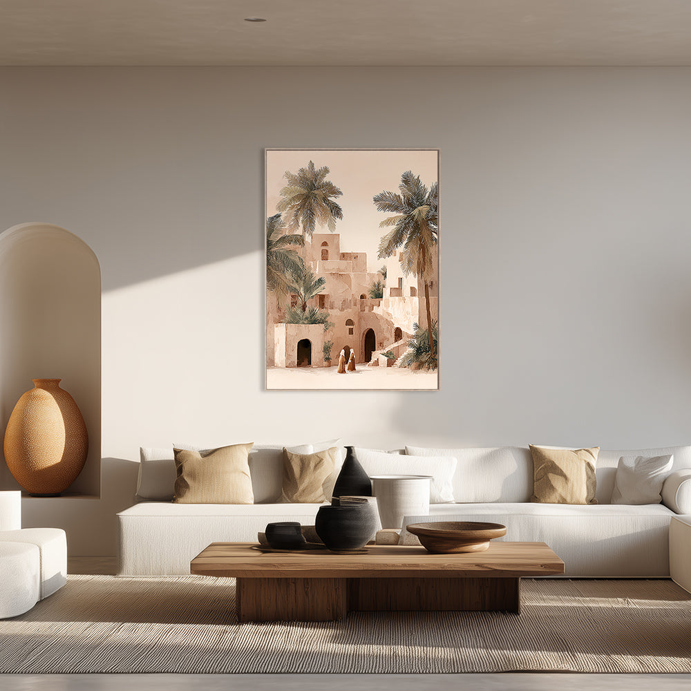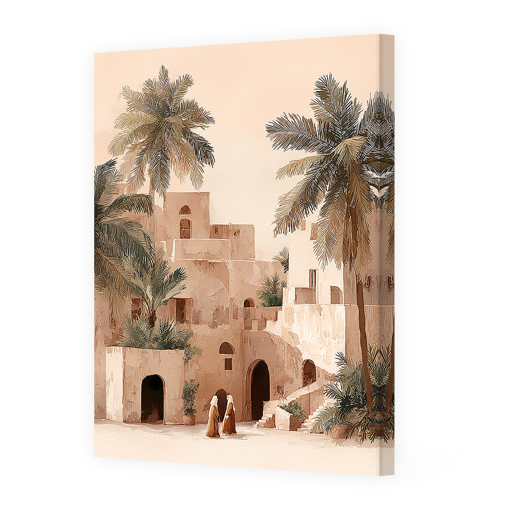 Scène paisible d'une oasis avec palmiers et architecture traditionnelle, évoquant calme et spiritualité.