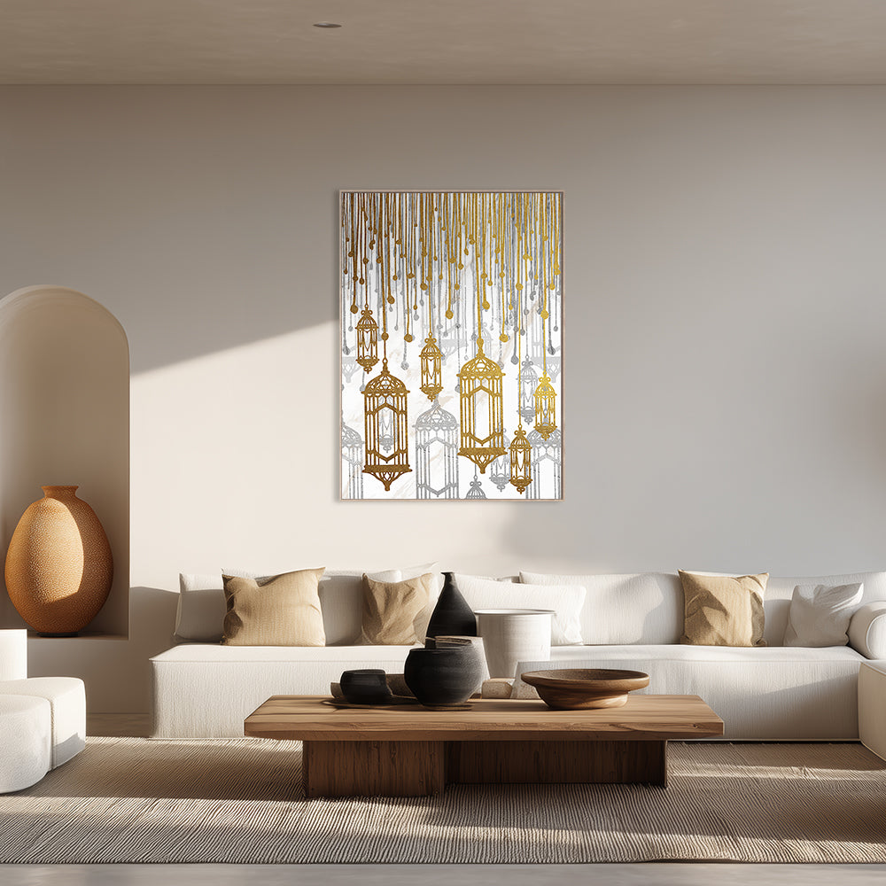 Élégantes lanternes dorées suspendues, créant une ambiance chaleureuse et traditionnelle.