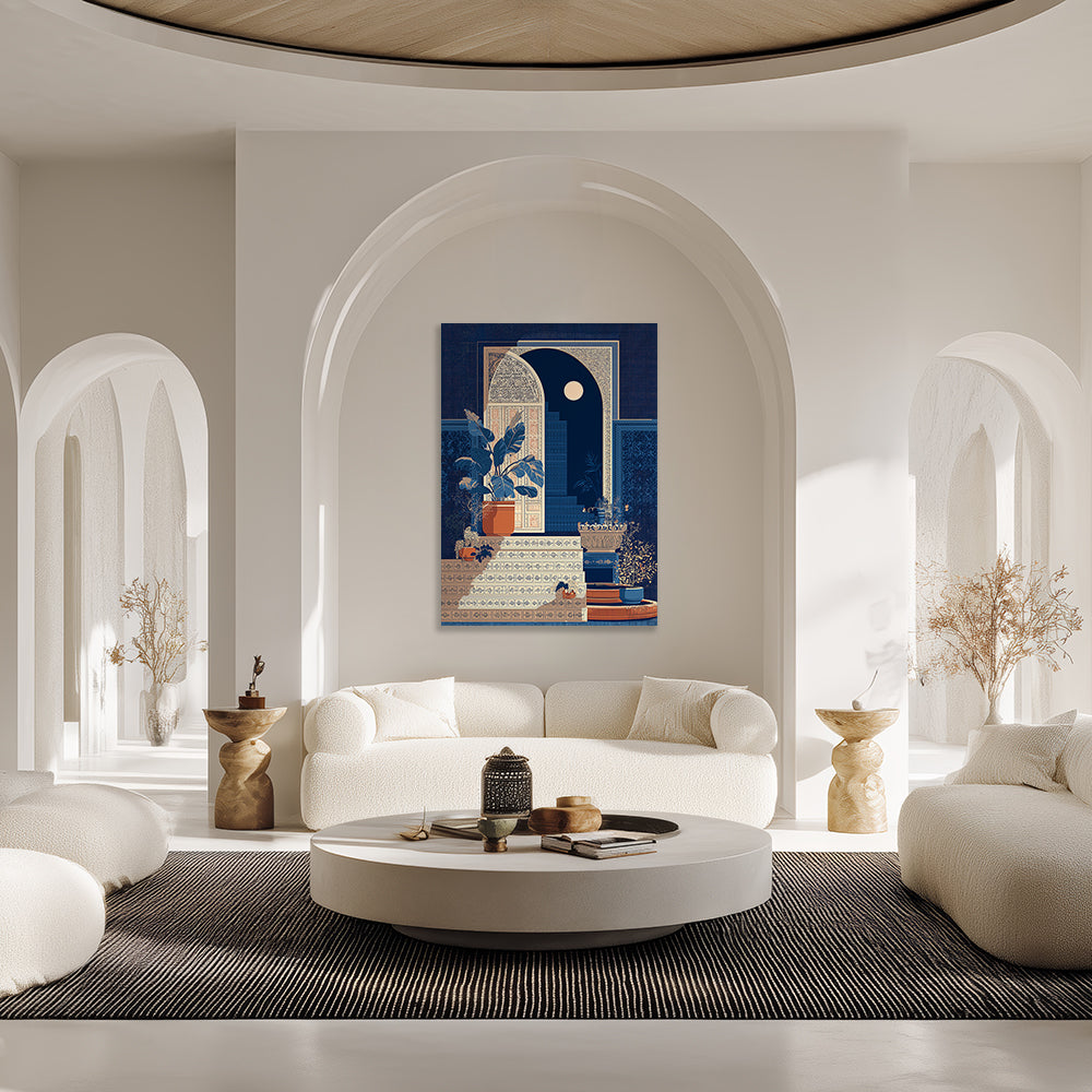 Élégant portail orné sous la lune, évoquant une ambiance orientale mystique.