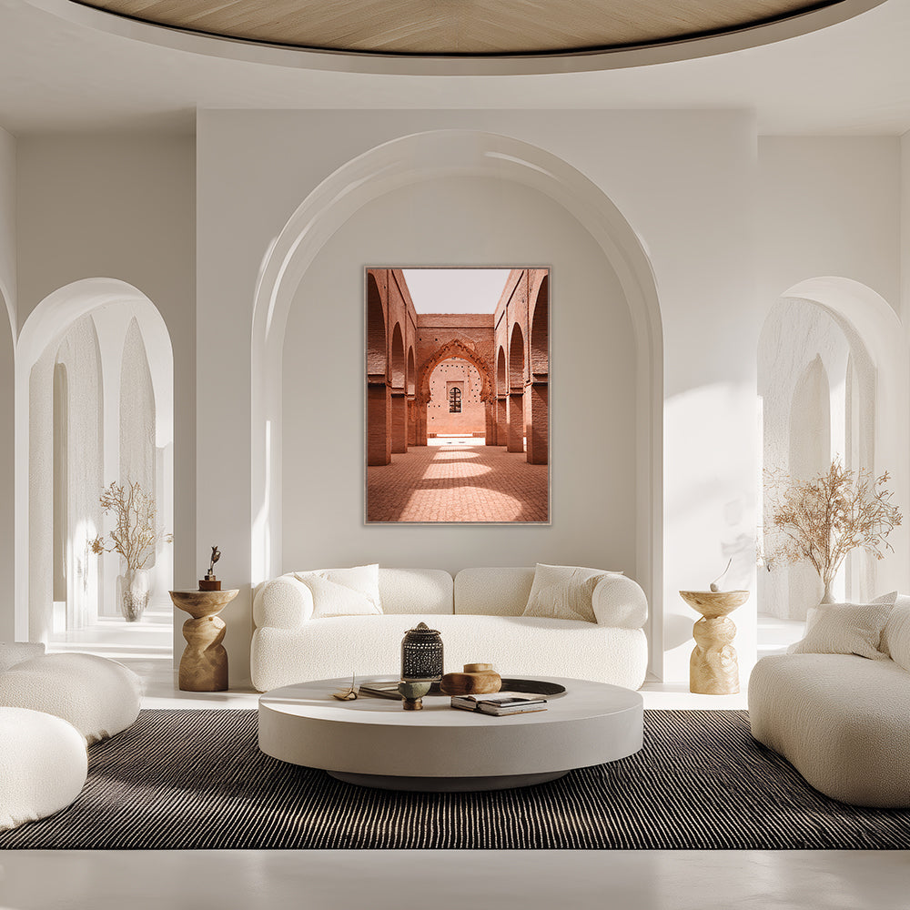 Élégantes arches en brique illuminées par le soleil, évoquant une ambiance traditionnelle et spirituelle.