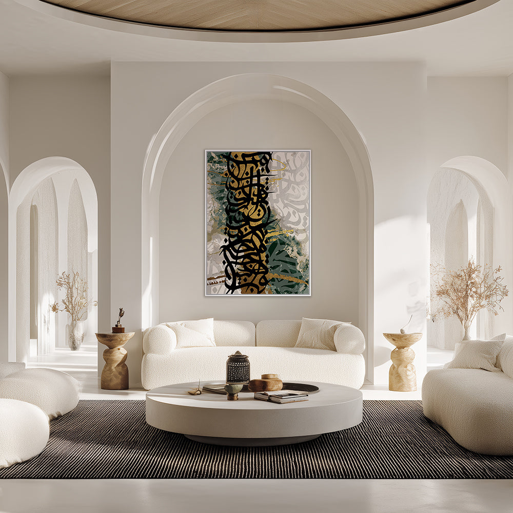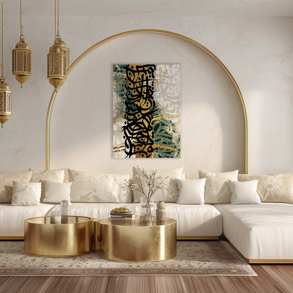 Calligraphie élégante et abstraite en noir et or, évoquant mystère et spiritualité.